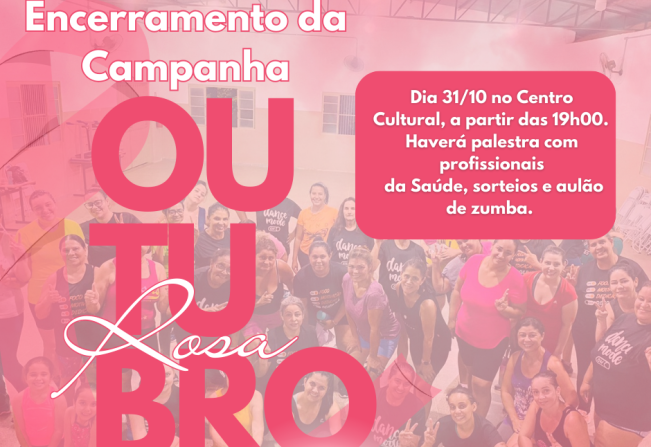 O encerramento será realizado no Centro Cultural (antigo CCI), a partir das 19:00 horas, através de palestras com profissionais da saúde, sorteios de brindes para as mulheres que realizaram o exame preventivo na UBS e logo após, um aulão de zumba com a professora Michelle Araújo.