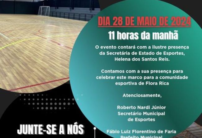 A Secretaria de Esporte e Lazer Flora Rica e Prefeitura municipal têm o prazer de convidar toda a população para a reinauguração do Complexo Poliesportivo, que será realizada no dia 28 de maio, terça-feira, às 11 horas da manhã. Este evento marcará a conclusão das obras de modernização e ampliação do espaço, tornando-o ainda mais adequado para a prática esportiva e lazer da nossa comunidade.