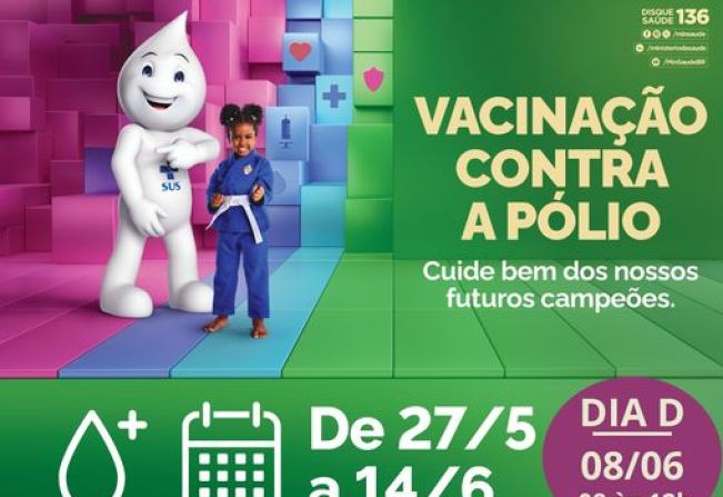 No próximo sábado, dia 8 de junho, a Saúde Municipal realizará o Dia D da Campanha de Vacinação contra a Poliomielite. A ação ocorrerá no Centro de Saúde, das 8h ao meio-dia, e tem como público-alvo crianças de 1 a 4 anos, que deverão receber a dose da vacina contra a polio. Além disso, menores de um ano deverão comparecer para atualização da caderneta de vacinação.